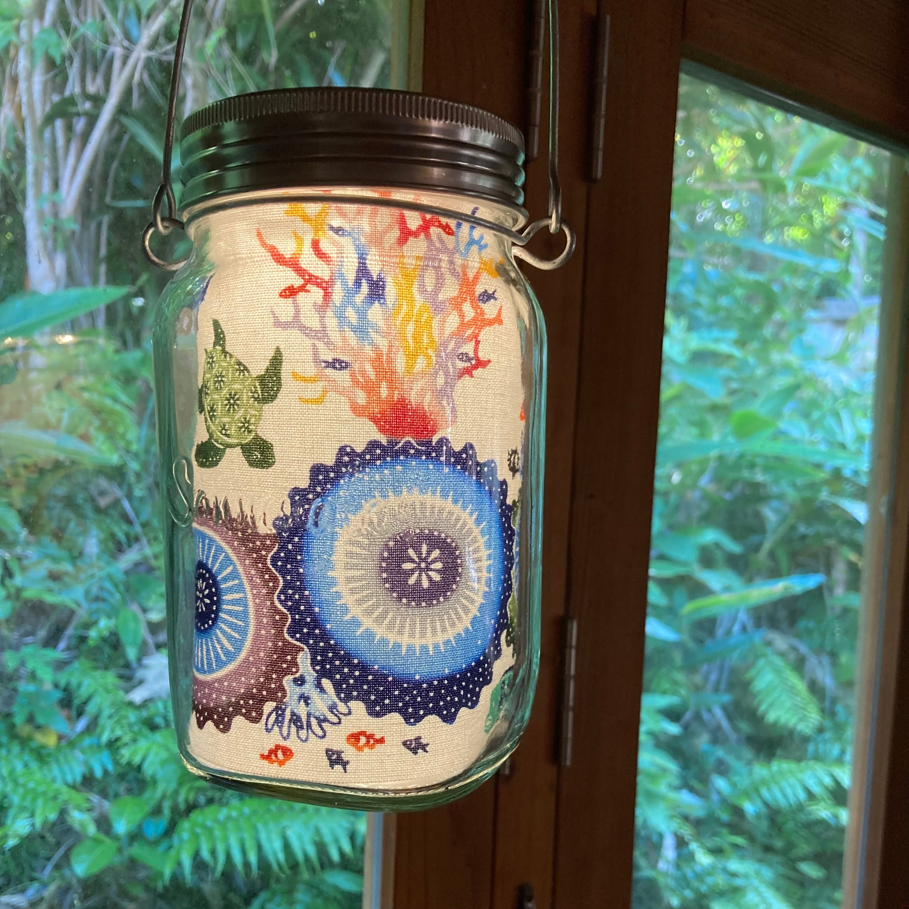 瓶の中に虹亀商店の紅型を詰め込んで、それはまるでボトルレターのようなわくわくした可愛らしさです。